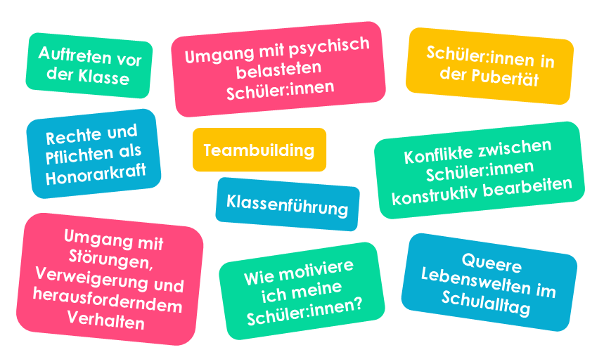 Die potenziellen Tätigkeiten von schulischen Honorarkräften reichen von der Einzelbetreuung bis zum Unterrichten im Klassenverband und sind somit sehr heterogen. Um auch die spezifischeren Themen abzudecken, die keinen Platz im Basismodul finden konnten, bieten wir daher auch regelmäßig Zusatzveranstaltungen zu weiterführenden und vertiefenden Themen an.